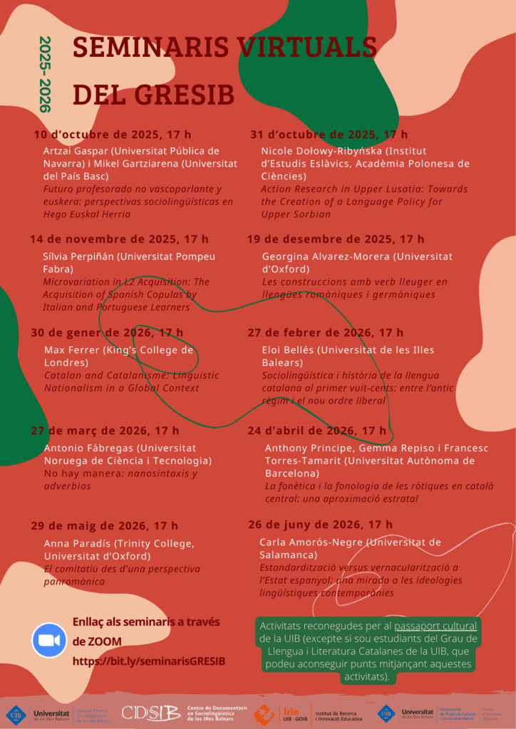 Recordau que és una activitat reconeguda per al passaport cultural de la UIB (excepte si sou estudiants del Grau de Llengua i Literatura Catalanes, que podeu aconseguir punts mitjançant aquestes activitats).